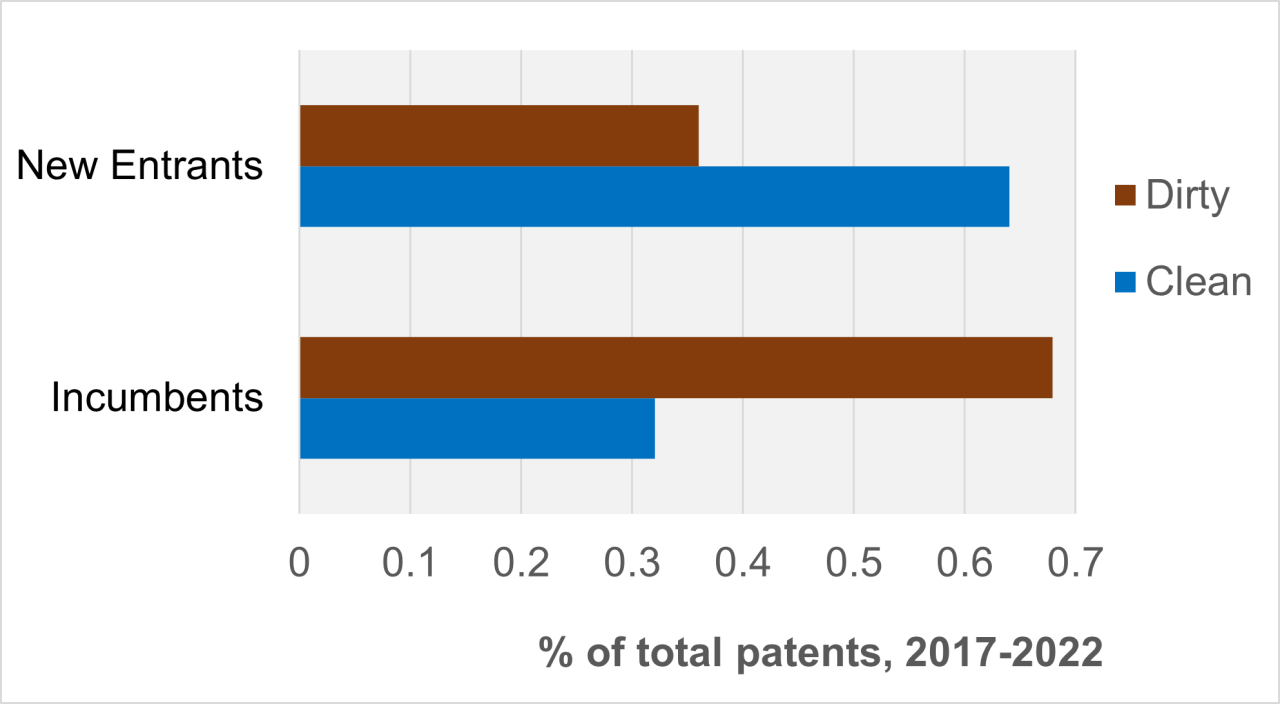Who is driving the cleaner end of the transition? Firms do not respond uniformly to directed technological change such as the green transition. Our study reveals a divergence between incumbents and new entrants, as shown in Figure 2. Established automobile manufacturers tend to pursue diversified innovation strategies. While their engagement with clean technologies has increased, they continue to devote substantial effort to improving combustion-engine systems. This balanced approach allows them to hedge against uncertainty while managing legacy investments.