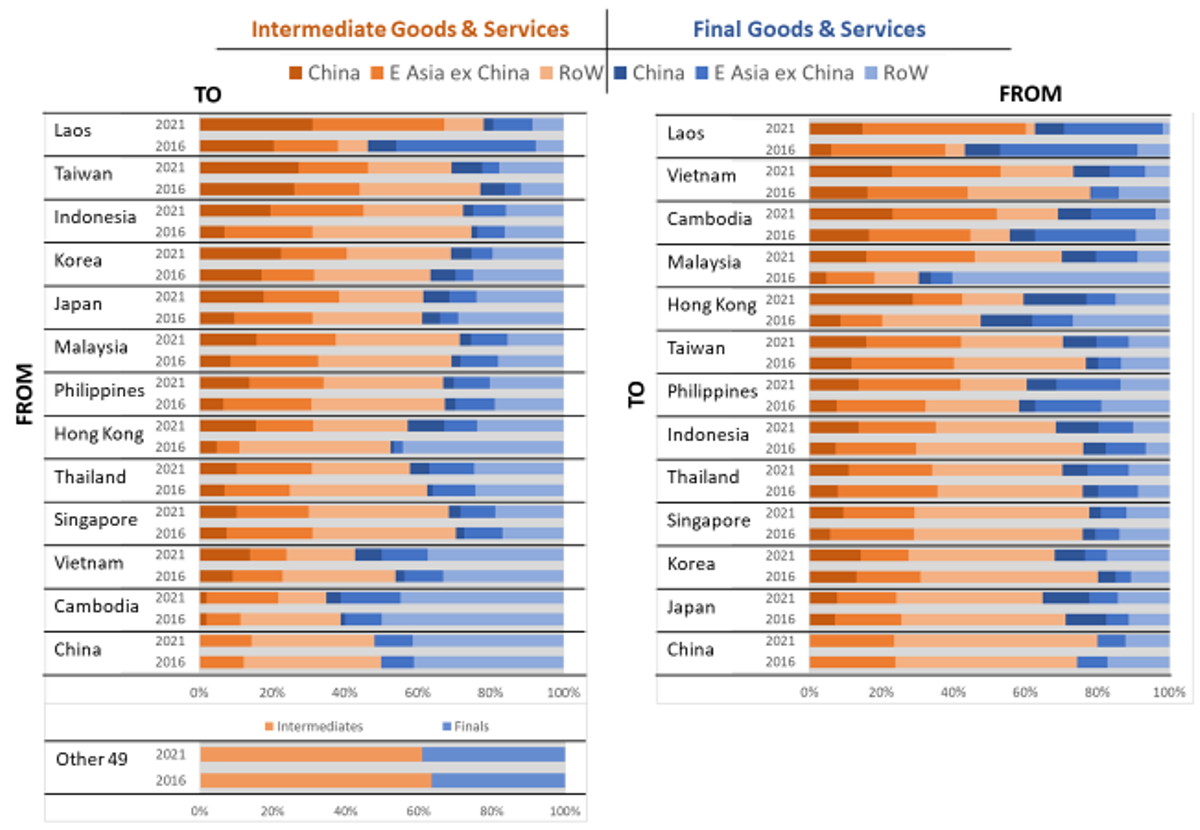 Figure 2 details trade flows by economy. The left panel captures exports from each economy to other blocks, the right panel imports to each economy from other blocks, where the other blocks are China, East Asia excluding China, and the rest of the world. The orange spans represent intermediate goods and services, the blue spans final goods and services. Magnitudes are given for each of 2016 and 2021.